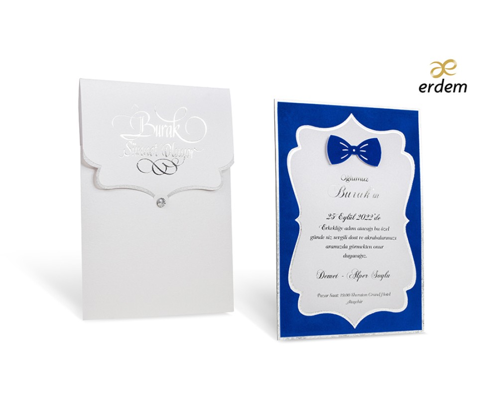 ● 100 Adet Fiyatıdır. ● K.D.V. Dahildir.● Davetiye Hakkında Bilgi: Erdem Sünnet 80911 Kendine özel zarf modeliyle ve içinde kullanılan mavi rengiyle dikkatleri üzerine toplayan modelin, inci detayı oldukça şık bir tasarım olarak görünüyor. Zarfta yazan sünnet çocuğunun ismi ve gümüş renkten kenarlıklar da modelin daha konsepte uygun olduğunu gözler önüne seriyor. Çocuğun ismine dair Sünnet Oluyor yazısı da oldukça hoştur.Davetiyede ofset, ve altın yaldız baskısı yapılabilmektedir, Ofset Baskı Ücretsiz, gümüş yaldız baskılarda +150 tl baskı ücreti eklenmektedir. Ayrıca zarfında da gümüş yaldız baskı vardır. 150 tl ekstra baskı ücreti eklenecektir.● Davetiyenin zarflama ve aksesuar takma işlemi müşteriye aittir.